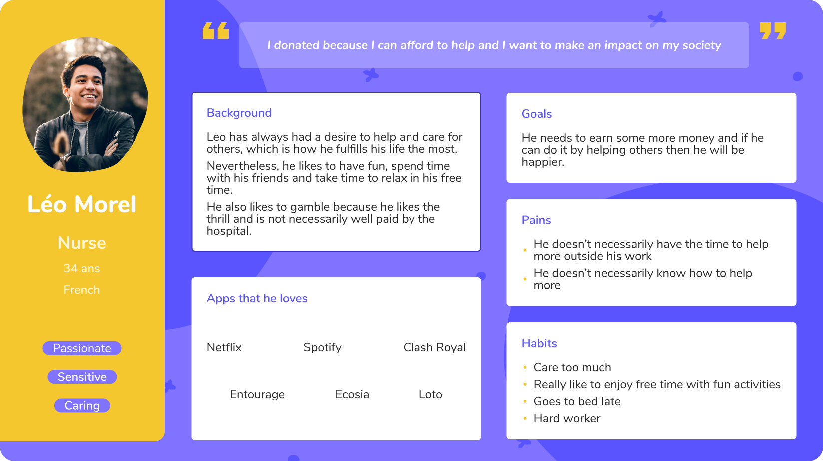 Meet Leo, a nurse in his thirties who enjoys helping people both during and outside of his workday. While altruistic by nature, he is also motivated by the possibility of earning a little extra money. Leo frequently plays on his phone, occasionally engages in gambling, and enjoys the thrill of taking risks.